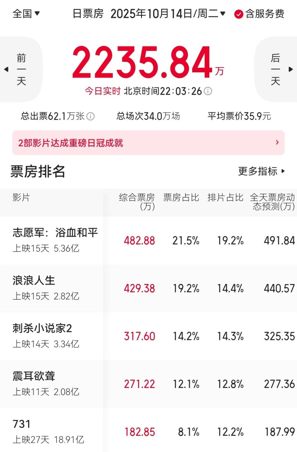 上周没有新片上映,市场全是国庆档和暑期档老片。前三分别为《志愿军3》《浪浪人生》和《刺杀小说家2》。