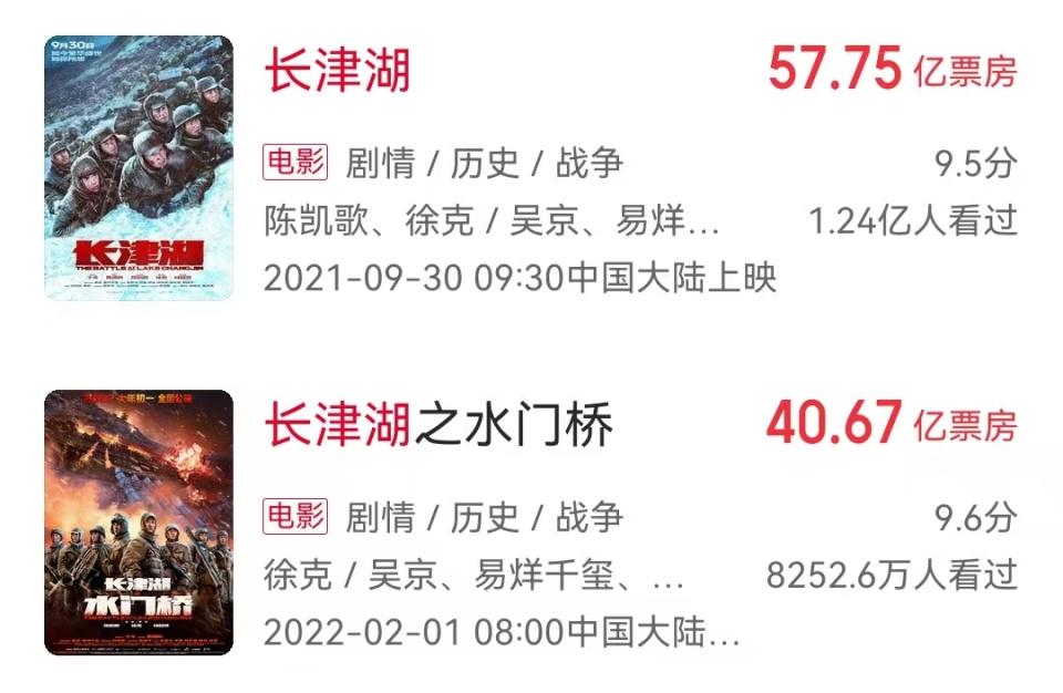 再有,前几年的《长津湖》那么火爆啊,也是博纳于冬主投的项目,全部大赚特赚,《长津湖》和《水门桥》系列两部,内地总票房轰下了98.42亿。