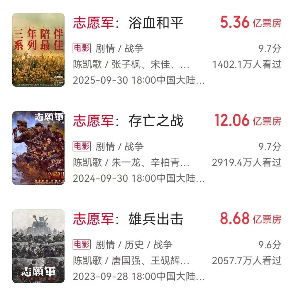 还有,国庆档头号种子大片《志愿军3》同样如此。